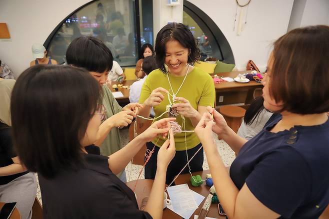 | ▲ 여럿이 함께 제주산호뜨개를 하는 프로젝트 참가자들 |