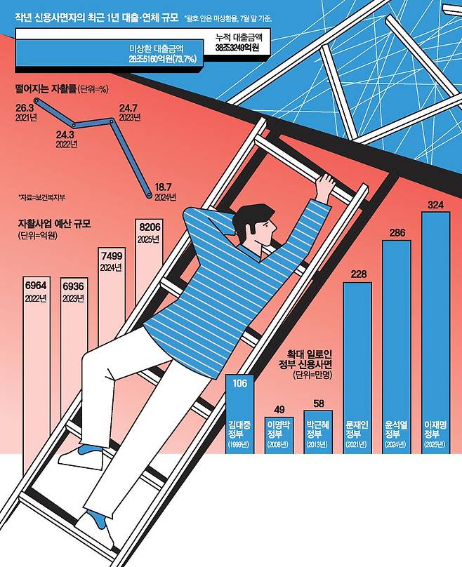이어 이재명 정부는 5000만원 이하 채무자 324만명을 대상으로 연말까지 빚을 모두 상환하면 연체 기록을 지워주겠다고 예고한 상황이다. 취약차주 채무 소각을 위해 올 하반기 설립될 배드뱅크에서도 113만명에 대한 지원이 이뤄질 예정이어서 최대 437만명이 수혜를 볼 것으로 전망된다. 역대 정부 중 최대 규모다.
