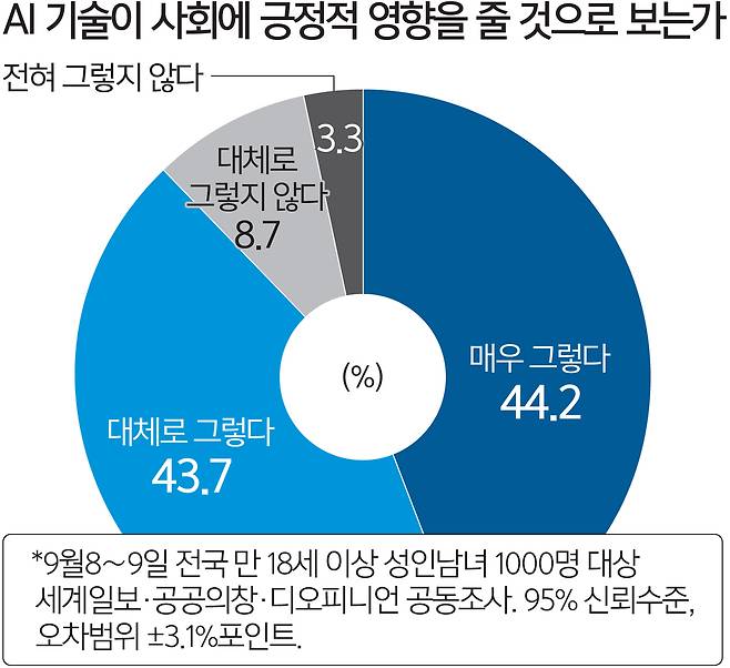 세계일보와 비영리 공공조사네트워크 ‘공공의창’이 여론조사기관 ‘디오피니언’을 통해 지난 8∼9일 만 18세 이상 전국 성인 남녀 1000명을 대상으로 공동 조사해 16일 발표한 결과에 따르면 AI 기술이 앞으로 우리 사회에 긍정적인 영향을 줄 것이냐는 질문에 응답자 87.9%가 ‘그렇다’(매우+대체로)고 답했다. AI의 추론 결과를 신뢰할 수 있느냐는 질문엔 응답자 86.9%가 ‘신뢰한다’(전적으로+어느 정도)고 했다.