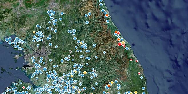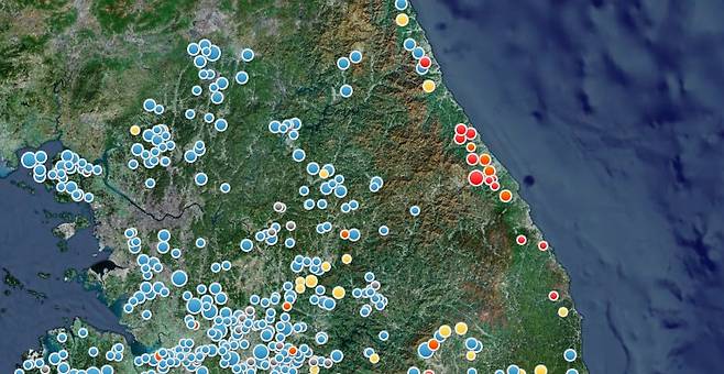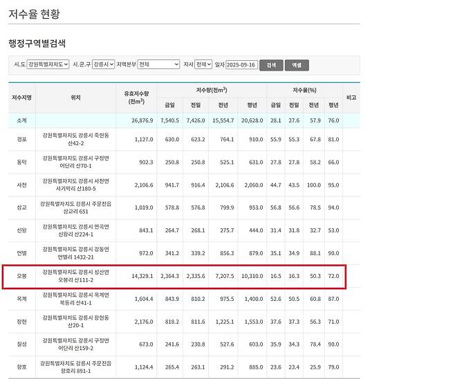 최근 강릉 지역 저수지 상황(농어촌공사 실시간계측정보)을 보면, 전체적으로 붉은 점(9월12일)으로 표시되던 저수지(9월 16일)는 반 정도인 6개로 줄어들며 다른 저수지는 50% 이상의 저수율을 회복한 것으로 나타났다. 그러나 오봉저수지는 여전히 붉은 상태를 유지하고 있다.