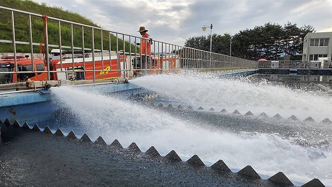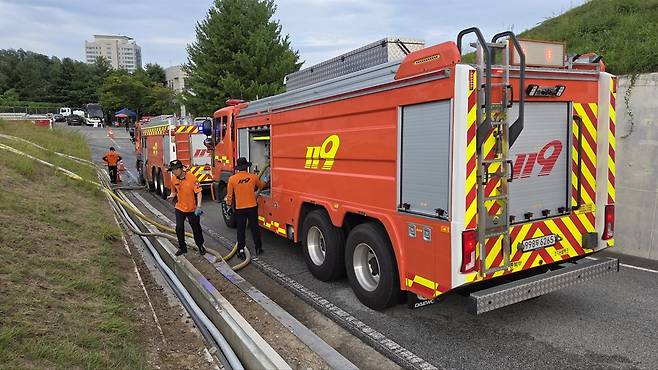 | ▲ 홍제정수장 물공급하는 소방차량 |