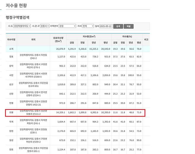 | ▲ 9월12일, 오봉저수지 저수율 현황 |