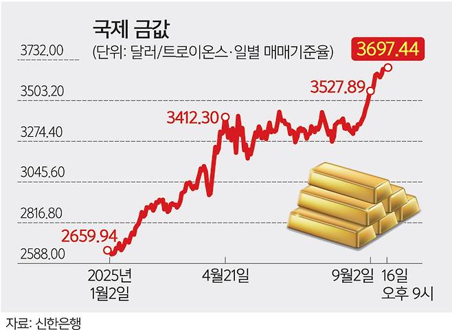 미국 금리 인하가 임박했다는 기대감에 금값이 트로이온스(31.1g·이하 온스)당 3700달러에 육박하며 사상 최고치를 경신했다. 코스피는 유동성 확대를 기대하는 외국인 투자자들이 16일 하루 동안 1조7000억원어치 사들이며 5거래일 연속 최고치를 경신했다. 그 영향으로 원·달러 환율은 한 달여 만에 처음으로 1370원대로 내려왔다.