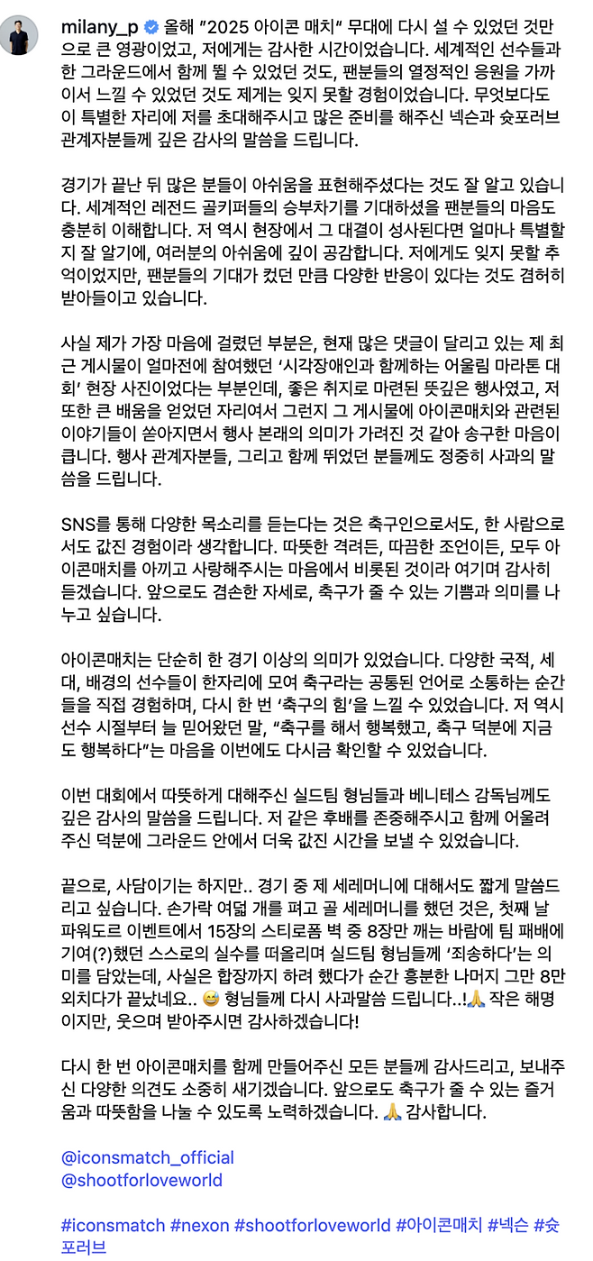 박주호는 다음 날인 15일 자신의 SNS에 "올해 '2025 아이콘 매치' 무대에 다시 설 수 있었던 것만으로 큰 영광이었다. 팬들의 열정적인 응원을 가까이서 느낄 수 있어 잊지 못할 경험이었다"며 장문의 글을 게재했다.