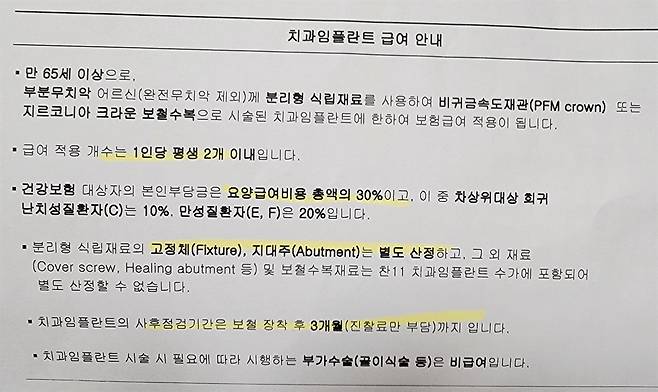 | ▲ 치과에서 안내해준 임플란트 시술 비용 65세 이상은 30%만 본인 부담금을 내고 평생 2개까지 임플란트를 시술 받을 수 있다. |