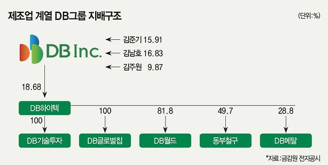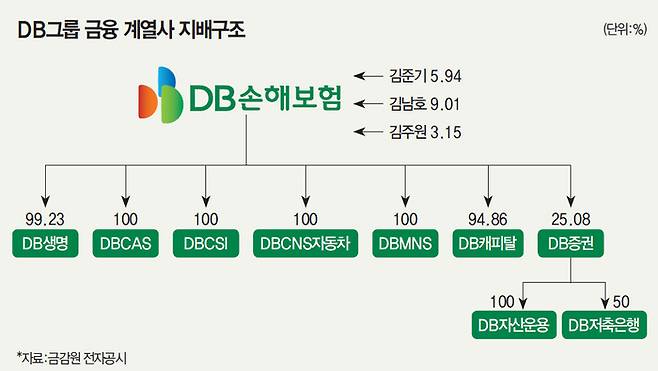 DB그룹 지배구조를 그려보면 이렇다. DB그룹 지배구조는 금융과 제조업 두 갈래다. 제조 계열은 김준기·김남호 → DB → DB하이텍, 금융 계열은 김남호·김준기 → DB손해보험 → DB생명보험·DB증권 → DB자산운용·DB저축은행 등 출자 구조다. 제조 계열은 DB, 금융 계열은 DB손해보험만 지배하면 출자 계열사를 간접 지배할 수 있다. 형식적으로는 그룹 출자 구조 정점에 있는 DB와 DB손보 모두 아들 김 명예회장이 최대주주다.