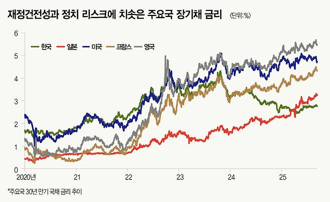 최근 주요 선진국 장기채 금리가 요동친다. 국가별 정치 리스크와 재정 불안 문제가 떠오르며 선진국에 대한 시장 신뢰가 훼손됐기 때문이다. 전문가들은 재정 부담이 크지 않고 상대적으로 기초체력(펀더멘털)이 튼튼한 국가 중심으로 선별 투자할 것을 권고한다. 특히 한국과 미국을 비교적 안전한 투자처로 꼽는 이가 다수다. 반면, 재정건전성과 정치 리스크가 커진 프랑스와 일본은 여전히 금리 상승 압력이 높아 투자에 신중해야 한다는 조언이다.