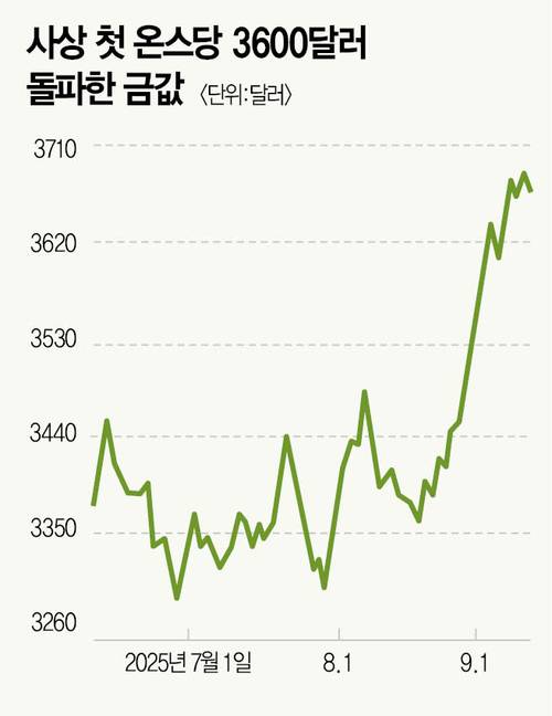 글로벌 국채에 대한 시장 신뢰가 흔들릴 땐 금이 매력적인 투자처로 떠오른다. 이 같은 시장 분위기를 반영하듯, 금 가격은 최근 연일 사상 최고치를 갈아치우는 중이다. 9월 들어 온스당 3500달러를 돌파한 금 현물 가격은 불과 일주일 만에 3600달러 선을 넘어섰다. 연초 이후 금 현물 가격은 35% 이상 급등했다.