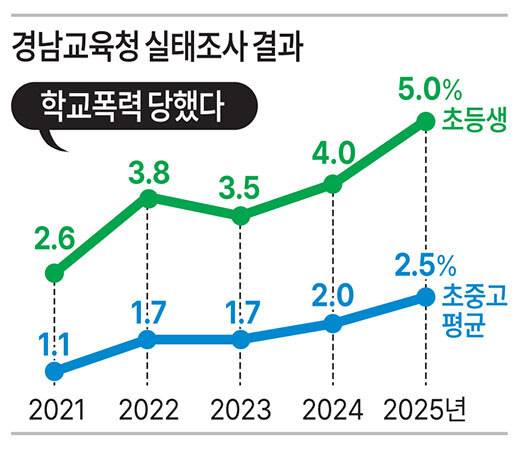 최근 5년간 초등학교 피해 응답률은 2020년 1.8%, 2021년 2.6%, 2022년 3.8%, 2023년 3.5%, 2024년 4.0%로 2배 이상 늘었다.