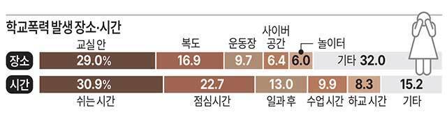 피해 시간은 쉬는 시간(30.9%)이 가장 많았고, 점심시간(22.7%), 일과 후(13.0%), 수업 시간(9.9%), 하교 시간(8.3%) 순이었다.