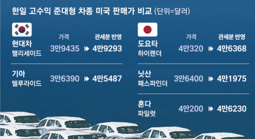 그런 만큼 대당 관세를 차값에 모두 반영한다고 가정할 경우 현대차그룹 차량은 일본차보다 비싸질 수밖에 없다. 25% 관세를 가격에 전가한다면 현대차 팰리세이드는 4만9293달러로 5개 차종 중 가장 비싸진다. 15% 관세 반영을 상정한 도요타 하이랜더(4만6368달러)보다 약 3000달러(약 400만원) 비싸다.