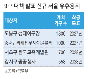 16일 국토교통부는 9·7 부동산 공급대책에 대한 추가 설명자료를 이같이 발표했다. 도봉구 성대야구장과 송파구 위례업무용지는 2027년 안에 착공을 추진한다. 서초구 한국교육개발원과 강서구 공공청사 용지는 2028년 착공을 목표로 토지 매입 절차에 나선다.