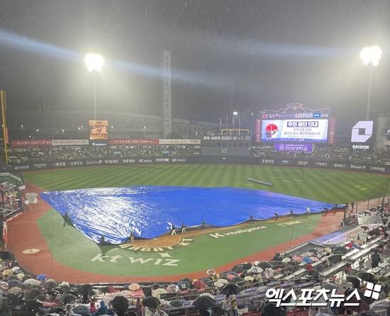 포수 강현우와 투수코치가 마운드를 방문한 사이 전부터 조금씩 내리던 빗줄기가 갑자기 굵어졌다. 오후 7시16분 우천으로 경기가 중단됐고, 1시간 44분 간의 기다림 끝에 오후 9시 경기가 재개됐다.
