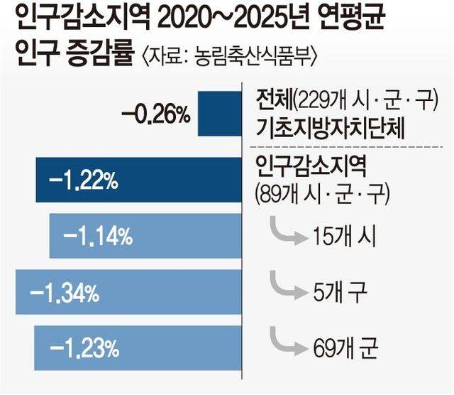 일단 내년에는 시범 사업으로 시작해 기초자치단체 6곳 정도를 지원한다는 계획을 세웠다. 대상 지역은 인구감소지역에 해당하는 군 단위 지역 중에서 추려내기로 했다. 지역소멸이 우려되는 인구감소지역 89곳 중 77.5%인 69곳이 군 단위 지역이라는 점을 감안한 조치다. 인구감소지역으로 분류되는 군 지역은 최근 5년 동안 인구가 매년 평균 1.23%씩 감소하고 있다. 229개 전체 기초자치단체 평균 감소율(0.26%)보다 0.97% 포인트 더 감소율이 높다.