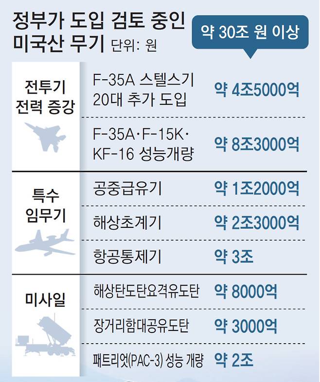 정부는 한미 간 협의에서 거론된 250억 달러, 즉 30조 원 이상의 미국산 무기 구매가 가능한지 검토 중인 것으로 알려졌다. 북한의 핵·미사일 대응 능력을 향상시키기 위한 자체 국방력 강화 수요에 따라 가능한 첨단 미국산 무기 구매를 검토한다는 것.