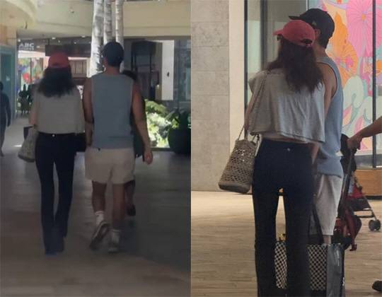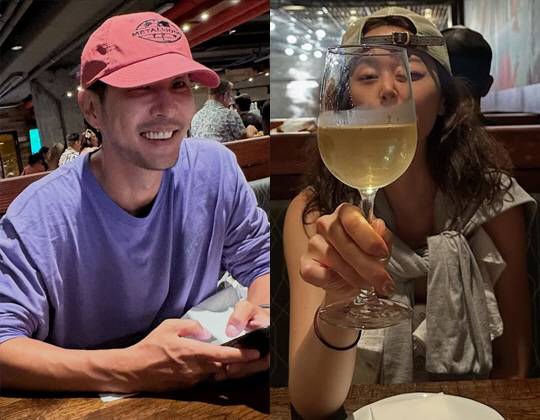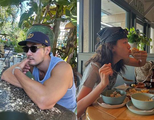 또 다른 사진에서는 하와이의 한 식당에서 빨간 모자와 보라색 긴팔 티셔츠를 입은 편안한 차림으로 '남친룩'을 선보이며 훈훈한 비주얼을 과시했다.