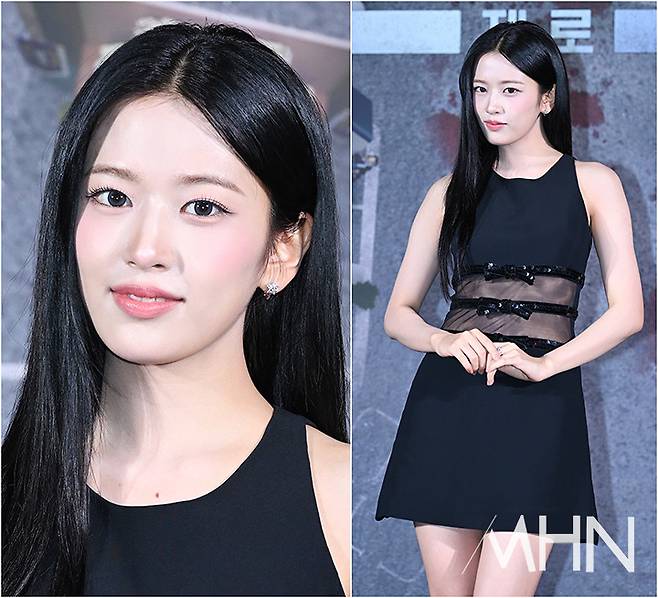 이날 안유진은 블랙 미니 드레스를 완벽하게 소화하며 등장했다. 허리 부분이 시스루로 탄탄한 복근을 드러내고 리본 장식으로 사랑스러움을 더해 시크하면서도 러블리함이 공존하는 패션을 완성시켰다.