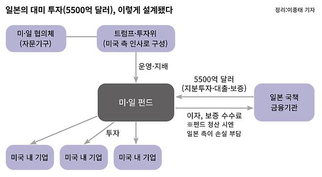 이 돈의 운용(미국 내 어떤 산업의 어떤 기업에 투자할 것인가)은 트럼프가 결정한다. 하워드 러트닉 상무장관은 일본의 ‘약속(commitments)’ 이행 여부를 감시하고 수시로 트럼프에게 보고한다. 일본 측이 약속을 어기면 트럼프는 관세율을 다시 올릴 수 있다.