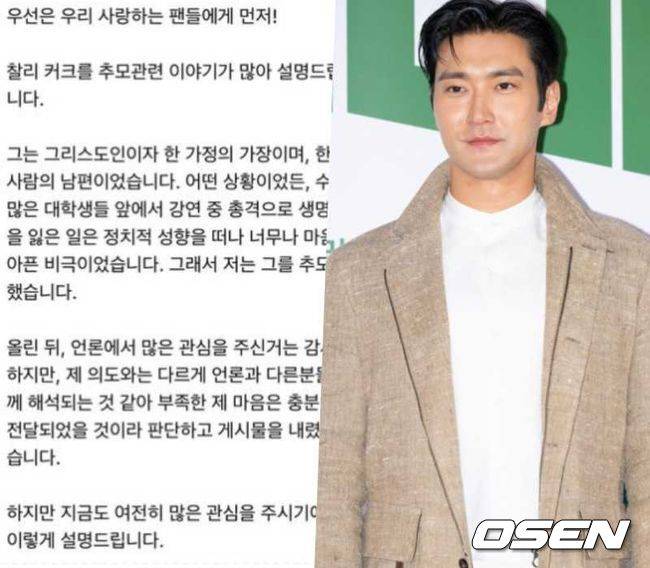 [OSEN=김수형 기자] 슈퍼주니어 최시원이 극우 성향 정치평론가 찰리 커크를 추모하는 글을 올린 뒤 거센 논란에 휩싸였다. 결국 그는 팬들에게 직접 장문의 메시지를 보내 해명했다. 데뷔 20주년인 해에 최시원 탈퇴요구까지 벌어진 상황이다.