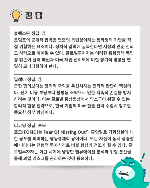 Q. 미국 연준의 정치적 압박이 글로벌 투자에 미치는 영향은 어떻습니까?