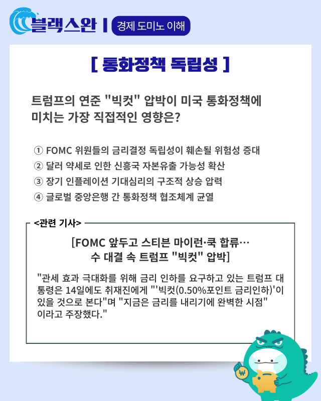 ✓ 미국 연준 정치적 독립성 모니터링: 트럼프 진영 3명 확보로 통화정책 불확실성 증대