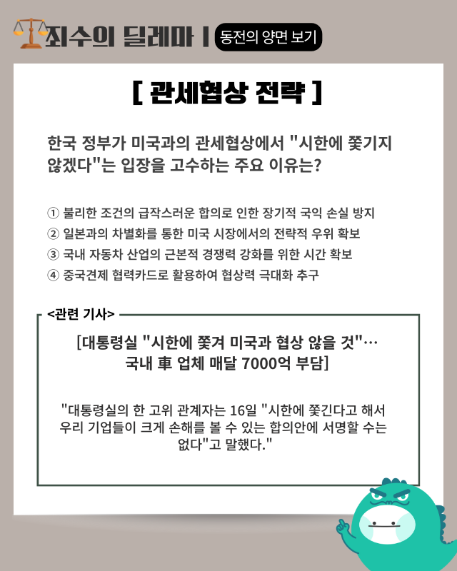 - 핵심 요약: 대통령실의 한 고위 관계자는 16일 “시한에 쫓긴다고 해서 우리 기업들이 크게 손해를 볼 수 있는 합의안에 서명할 수는 없다”고 말했다. 이현욱 IBK투자증권 연구원은 “9월 말 한미 간 3500억 달러 규모의 대미 투자 펀드 협정이 원만히 체결되더라도 연내 자동차 및 부품 관세 인하는 현실적으로 어려운 상황”이라고 진단했다. 지난해 말 기준 일본(150만 대)과 한국(143만 대)은 미국 자동차 수입 시장에서 나란히 2·3위를 기록했다. 수출액도 일본은 399억 달러, 한국은 374억 달러로 비슷하다. IBK투자증권에 따르면 대미 수출 자동차에 25% 관세가 지속될 경우 현대차는 매달 4267억 원, 기아는 3364억 원의 비용 부담이 발생한다. 이는 양국이 잠정 합의한 15% 관세가 적용될 때보다 각각 1709억 원, 1348억 원 더 소요된다.