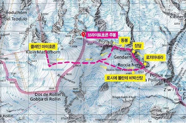 다섯 개의 연봉을 횡단하는 트래버스 등반을 많이 하는데 우리는 그중 하프 트래버스를 계획했다. 로치아네라, 장담, 동봉을 등반하기로 했다. 산행의 출발지는 작은 마터호른이란 뜻의 클레인 마터호른Klein Matterhorn에 위치한 글레이셔 파라다이스까지는 체르마트에서 케이블카를 이용해 고도를 3,800m까지 올릴 수 있다. 겨울에는 스키어들로 붐비는 곳으로 이탈리아 체르비니아까지 넘나들며 스키를 즐길 수 있다.