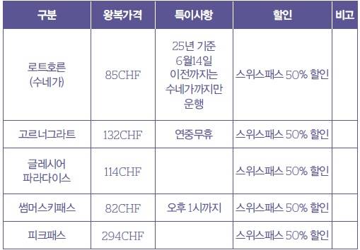 스위스 체르마트Zermatt 주요 산악 케이블카 및 철도 노선인 로트호른Rothorn, 고르너그라트Gornergrat 그리고 마터호른 글레이셔 파라다이스Matterhorn Glacier Paradise 요금은 아래와 같다. 2025년 기준 여름 시즌(주로 5~10월)에 해당하는 요금 기준이며 비수기나 겨울철에는 요금이 다를 수 있다.