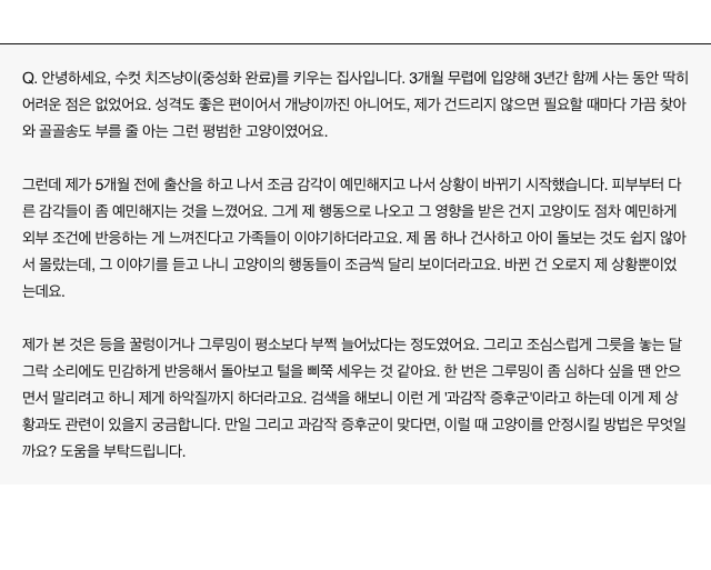 안녕하세요. 반려동물의 행동문제를 과학적이고 체계적으로 치료하는 ‘하이 반려동물 행동 클리닉’의 원장 이우장 수의사입니다. 이번에는 환경 변화 후 과도한 그루밍과 감각이 예민해진 증상이 걱정되는 보호자님의 사연이네요. 보호자님은 이게 '고양이 과감작 증후군'(Feline Hyperesthesia Syndrome · FHS)에 해당되는지 궁금해하셨는데요. 우선 FHS가 어떤 질환인지부터 알아보도록 하겠습니다.