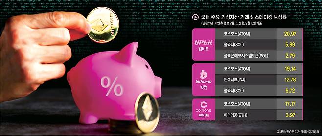 17일 가상자산 업계에 따르면 현재 국내 가상자산 거래소에서 이용할 수 있는 가상자산 스테이킹 보상률은 코스모스(ATOM)가 연 17∼20%, 솔라나(SOL)가 5∼6%대에 형성돼 있다. 스테이킹이란 가상자산을 특정 블록체인 네트워크에 예치, 그 대가로 보상을 받는 것을 말한다. 지분증명(Proof of Stake, PoS) 개념에 기반한 네트워크에서 사용자들이 보유한 가상자산을 네트워크에 맡기면 네트워크는 이 자산을 이용해 블록을 생성하고 검증한다.