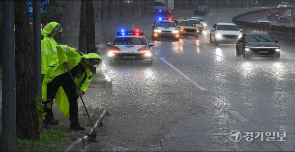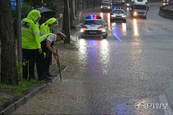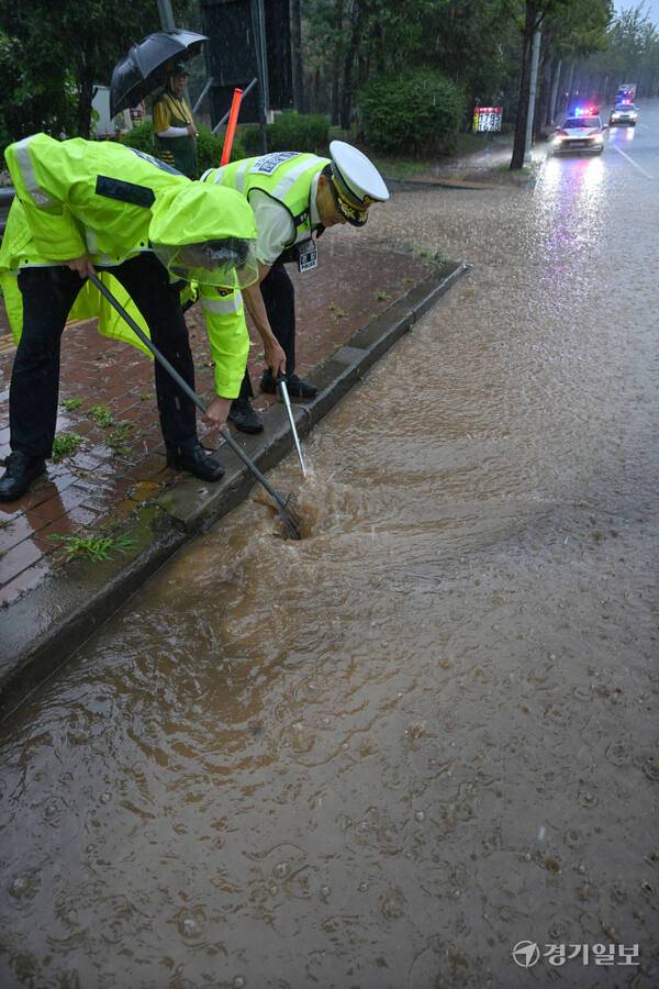 경기지역에 소나기성 집중호우가 쏟아진 16일 오후 수원특례시 장안구 한 도로가 침수되자 장안경찰서 교통과 직원들이 막힌 하수구를 뚫어 빗물을 빼내고 있다.
