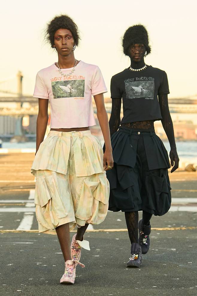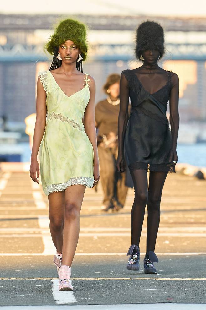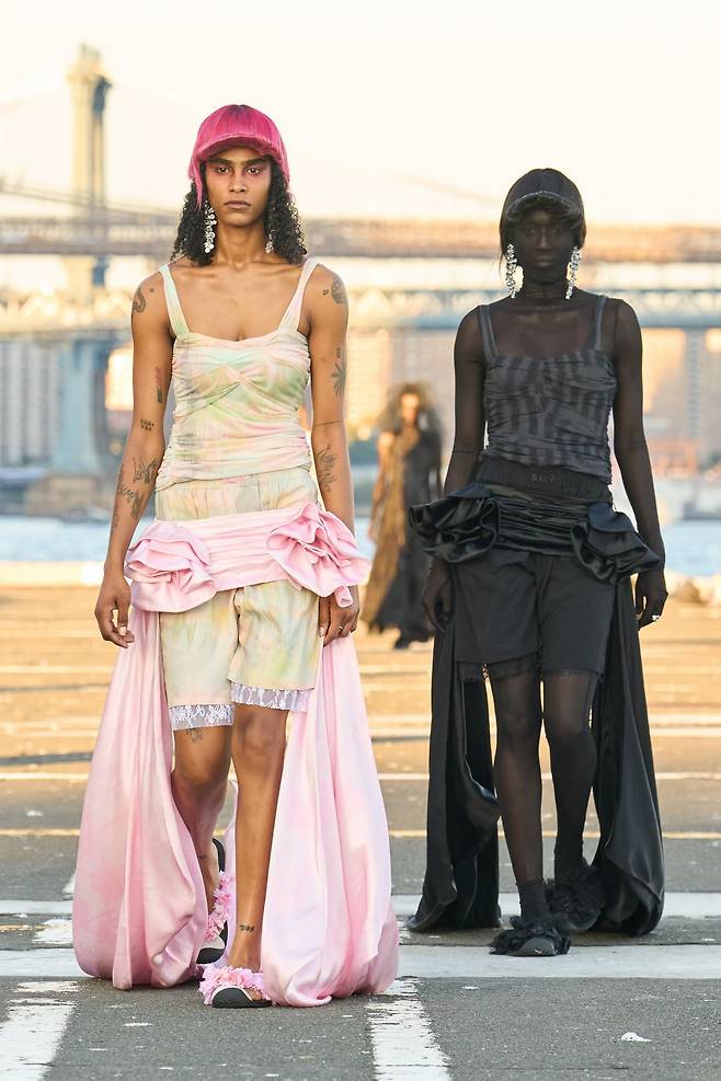 모델 뒤로 또 다른 모델이 함께 걸어 나옵니다. 콜리나 스트라다 의 2026 봄/여름 컬렉션입니다. ‘빛과 그림자’를 주제로 한 이번 컬렉션은, 같은 실루엣과 아이템을 갖춘 두 모델을 나란히 세워 창의적인 연출을 선보였죠. 드레이프 실루엣과 레이어드 드레스는 빛의 각도에 따라 전혀 다른 표정을 남겼습니다. 브루클린 브리지를 배경으로 한 장면은 도시의 풍경과 패션이 맞물리며 압도적인 장관을 완성했죠. 마치 뉴욕의 거리와 다리를 직접 걷는 듯한 에너지가 런웨이를 가득 채웁니다. 뉴욕의 거리와 브리지를 걷는 듯한 에너지를, 여러분도 느껴보고 싶지 않으신가요?