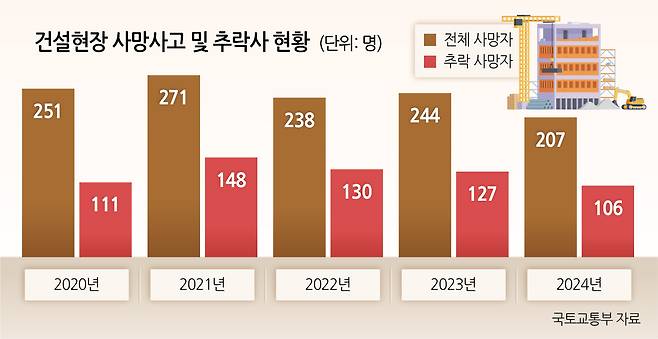 국토교통부에 따르면 지난 2021년 271명을 기점으로 2022년 238명, 2023년 244명, 2024년 207명을 기록했다. 그중 절대적인 비중을 차지하는 추락 사망자의 수도 2021년 148명, 2022년 130명, 2023년 127명, 2024년 106명으로 줄었다.