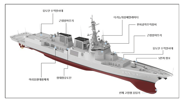 국내 기술로 개발한 첨단 통합소나체계를 탑재해 적 잠수함 및 어뢰 등 수중 위협에 대한 탐지능력이 크게 향상됐고, 장거리대잠어뢰와 경어뢰를 활용한 대잠공격이 가능하며, 최근 도입된 MH-60R(시호크) 해상작전헬기를 탑재해 더욱 강력한 대잠작전 능력을 보유할 예정입니다.