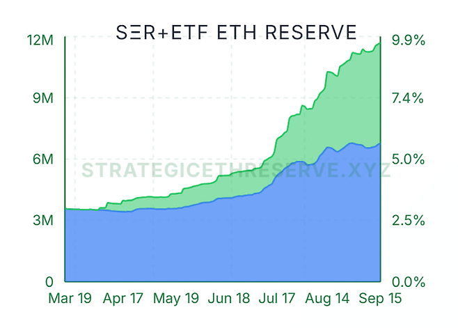스트레티직 ETH 리저브에 따르면 상장사, 웹3 기업, 정부 등이 보유한 이더리움과 상장지수펀드(ETF)가 보유한 이더리움의 합이 9.72%를 기록했다.
