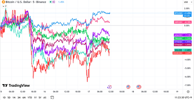 도지코인이 3.07% 하락해 가장 많이 떨어졌고, 솔라나도 2.89% 하락했다.