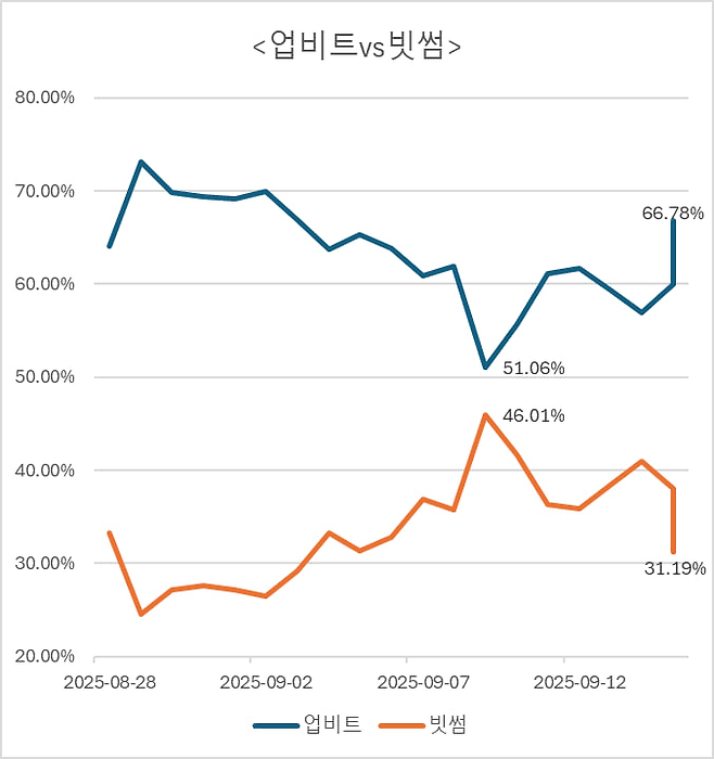 올해내내 비슷한 수준을 유지하던 업비트의 점유율은 9월들어 빗썸이 ‘월드코인(WLD)’의 상승세를 앞세워 점유율을 크게 끌어올리며 흔들렸다.