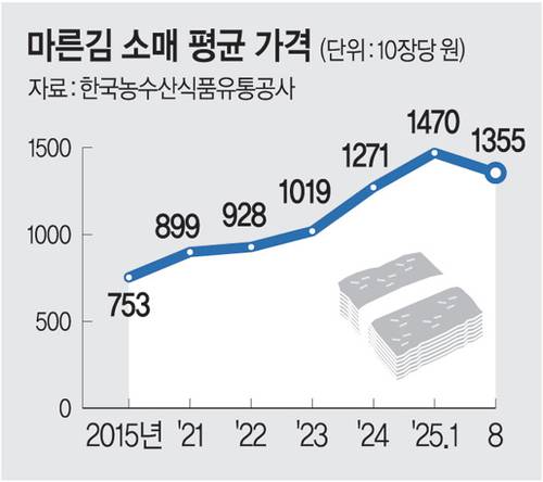 한국농수산식품유통공사(aT)에 따르면 지난 8월 마른김 소매 평균가는 10장에 1355원으로, 평년(990원) 대비 약 37% 올랐다. 10년 전 10장당 700원대였던 김은 현재 1400원대까지 상승했다. 특히 최근 세계적인 인기를 끌고 있는 케데헌 내 주인공들이 김밥을 먹는 장면이 전 세계적으로 인기를 끌면서 CU의 김밥 매출이 전년대비 231% 증가하는 등 김의 세계적인 수요는 계속해서 증가할 전망이다.