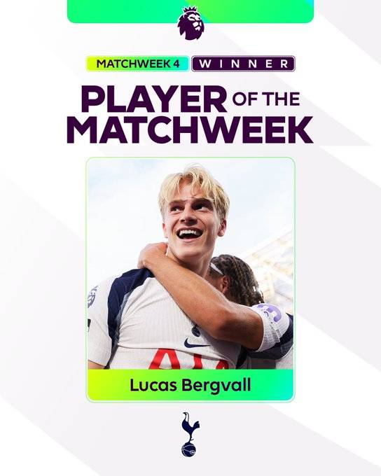 프리미어리그 사무국은 16일(한국시간) "토트넘 홋스퍼 미드필더 루카스 베리발이 팬들이 뽑는 프리미어리그 4라운드 이 주의 선수로 선정됐다"고 공식 발표했다.