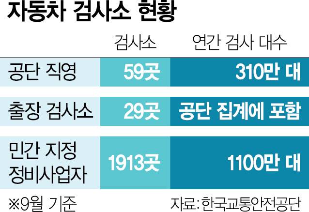 엎친 데 덮친 격으로 공단 검사소의 절대적인 수도 부족하다. 이달 기준 전국 자동차검사소 1913곳 중 공단 직영은 전체의 3%가량인 59곳에 불과한 것으로 확인됐다. 반면 민간 지정정비사업자는 1900곳에 달한다. 검사 물량도 격차가 크다. 공단 검사소는 한 곳당 연평균 5만 2542대를 처리하지만 민간은 한 곳당 5750대 수준이다. 사실상 공단 한 곳이 민간 아홉 곳의 몫을 소화하는 셈이다.