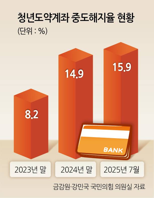 특히 소득·저축 여력이 부족한 청년일수록 중도해지에 내몰리는 모습이다. 금융감독원에 따르면, 올 7월 말 기준 청년도약계좌 누적 중도해지 인원은 35만8000명으로, 전체 가입자(225만명·일시 납입 가입자 포함)의 15.9%에 달한다. 2023년 말(8.2%)에 비해 해지율이 두 배 가까이 뛰었다.