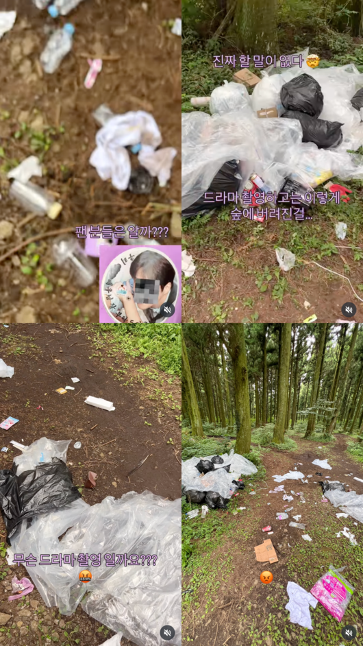 앞서 지난달 한 누리꾼의 SNS 계정에는 "드라마 촬영하고는 쓰레기를 숲에.. 에휴 팬분들이 보낸 커피홀더랑 함께"라는 글과 함께 제주도 자연숲의 모습이 담긴 영상이 공개됐다.
