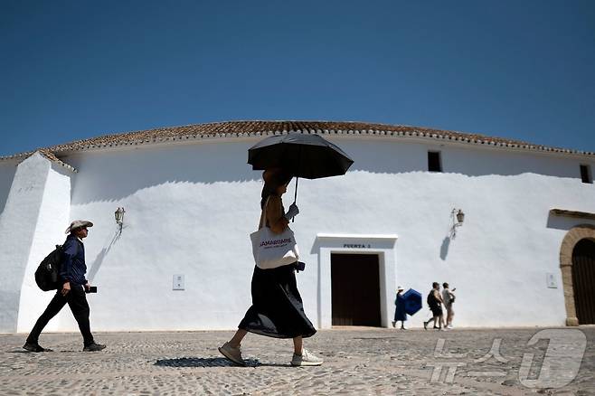 2025년 7월 2일(현지시간) 스페인 남부 론다에서 한 여성이 장갑과 모자를 착용한 채 양산으로 햇볕을 가리고 있다.