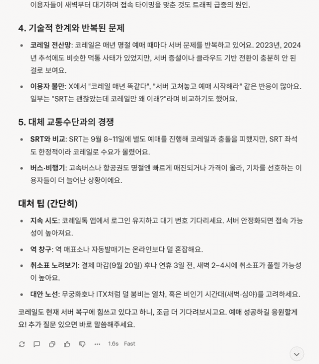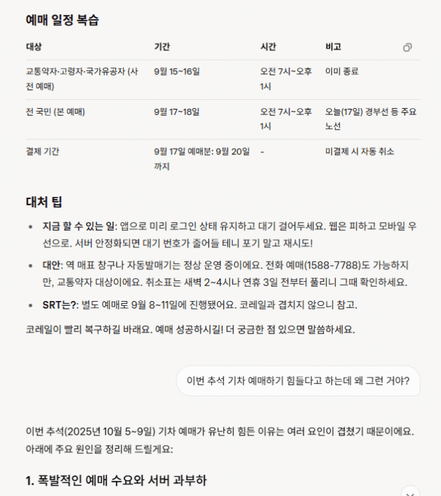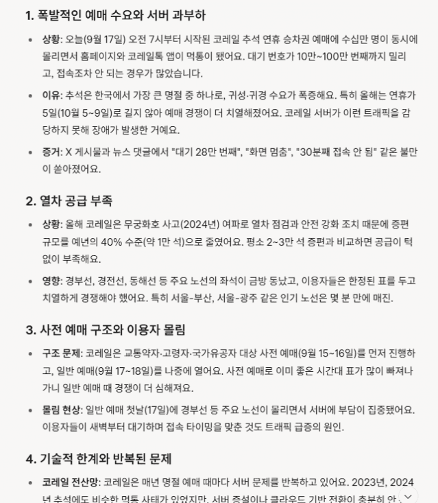 이유: 추석은 한국에서 가장 큰 명절 중 하나로, 귀성·귀경 수요가 폭증해요. 특히 올해는 연휴가 5일(10월 5~9일)로 길지 않아 예매 경쟁이 더 치열해졌어요. 코레일 서버가 이런 트래픽을 감당하지 못해 장애가 발생한 거예요.