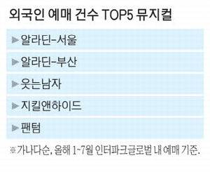 올 상반기 외국인 예매가 가장 많았던 뮤지컬 톱5는 '알라딘'(서울·부산), '웃는 남자', '지킬앤하이드', '팬텀' 등이다. 브로드웨이 오리지널인 '위키드' 공연에도 외국인 관람객이 상당 비중을 차지한 것으로 나타났다. 한국을 방문한 외국인 관광객이 공연까지 즐기려는 '연계 수요'가 활발해졌다는 분석이다.