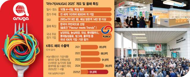 프랑스 파리의 시알 파리(SIAL Paris), 일본 도쿄의 푸덱스 재팬(FOODEX JAPAN)과 함께 세계 3대 식품 박람회로 꼽히는 아누가는 올해 110개국 8000여 개 기업이 참가하는 역대 최대 규모로 진행된다. 특히 K푸드에 대한 인기가 전 세계로 확산하는 가운데 한국이 주빈국 자격으로 나서면서 국내 식품 기업들이 해외 시장 진출에 힘을 실을 전망이다. 주빈국은 부스 면적 확대와 쾰른 시내 및 전시장 홍보 강화, 글로벌 미디어 노출 등의 혜택을 받는다. 한국식품산업협회는 남양유업·농심(004370)태경·대상·롯데웰푸드·롯데칠성(005300)음료·빙그레·풀무원 등 13개 기업과 함께 선도기업관을 운영할 예정이다. 송미령 농림축산식품부 장관도 현장을 찾는 것을 검토 중이다.