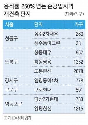 현재 서울 준공업지역에 속한 노후 단지는 총 96곳이다. 영등포구가 34곳으로 가장 많고 이어 구로구(22곳), 강서구(21곳), 금천구(7곳), 성동구·도봉구(각각 6곳) 순이다. 이 가운데 성동구 성수2차대우(297%)·성수동아그린(279%), 영등포구 당산2가현대(299%)·양평한신(282%) 등이 용적률 250~300% 단지다. 도봉구 창동대우(284%)·창동쌍용(292%), 구로구 구로현대(250%) 등도 마찬가지다.