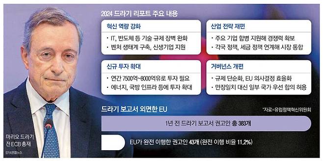 유럽연합(EU)이 미국·중국과 벌이는 경쟁에서 크게 뒤처진 상황을 타파하기 위해 'EU 경쟁력의 미래' 보고서를 1년 전 발표했던 마리오 드라기 전 유럽중앙은행(ECB) 총재가 또다시 EU 지도자들을 질타했다. 드라기 전 총재는 지난 1년 동안 아무것도 하지 않은 지도자들의 무능함 때문에 EU 경쟁력이 1년 전보다 오히려 더 후퇴했다고 비판했다.