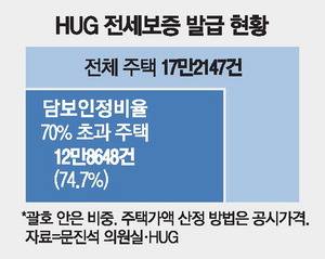 17일 문진석 더불어민주당 의원이 확보한 자료에 따르면 HUG가 발급한 전세보증 가운데 담보인정비율이 70%를 초과하는 건수는 12만8648건으로 집계됐다. 이는 전체 전세보증(17만2147건)의 약 75%에 달하는 비중이다. 주택 유형별로 보면 비아파트가 11만5127건, 아파트가 1만3521건이다. 전세보증은 집주인이 전세금을 떼먹었을 때 HUG가 대신 돌려주는 보호 제도다. 현재 이 보증은 담보인정비율이 90% 이하일 때만 가입할 수 있다. 담보인정비율은 집값에서 세입자의 전세금과 집주인의 대출(선순위 채권) 비중을 나타낸다. 보통 집값에서 전세보증금이 차지하는 비율로 여겨진다.