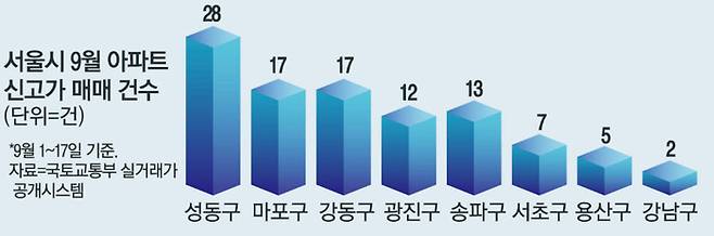 국토교통부 실거래가 공개시스템에 따르면 9월 들어 성동·마포·강동구에서는 잇따라 신고가 거래가 나오고 있는 반면, 강북·금천·노원·도봉구 등에서는 신고가 거래가 한 건도 없었다.